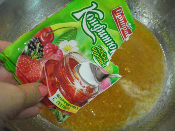 - pektini ekleyip iyice karıştırın ve en fazla 3 dakika pişirin (aksi takdirde koyulaştırıcının jelleşme özellikleri bozulur), 1-2 dakika yeterlidir.